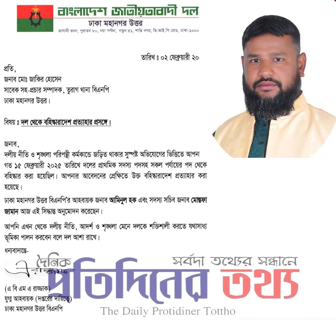 তুরাগ থানা বিএনপির সাবেক সহ-প্রচার সম্পাদক জাকির হোসেনের বহিষ্কারাদেশ প্রত্যাহার