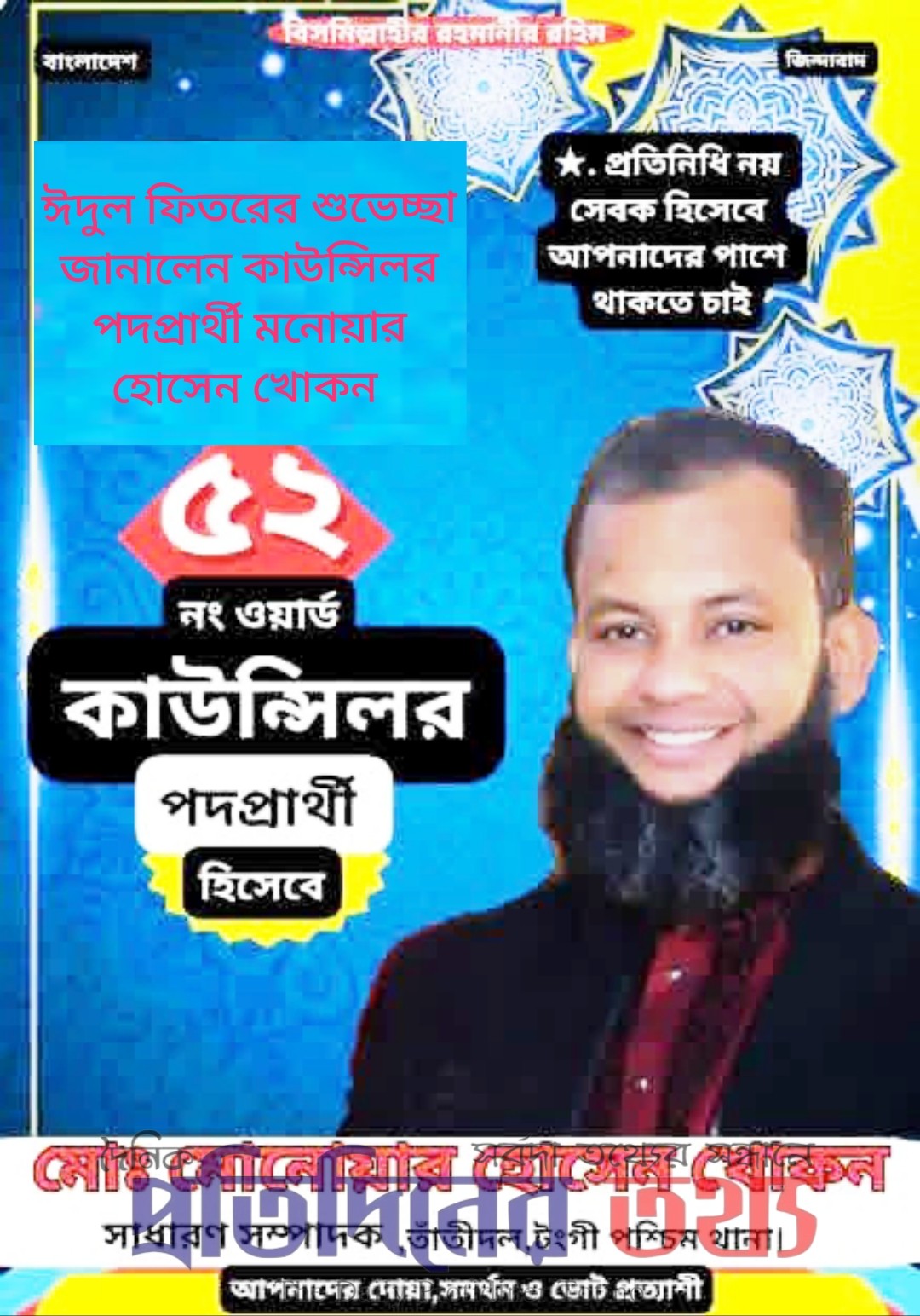 পবিত্র ঈদুল ফিতর উপলক্ষে গাজীপুর সিটি কর্পোরেশনের ৫২ নং ওয়ার্ডবাসীকে আন্তরিক শুভেচ্ছা ও ঈদ মোবারক জানিয়েছেন কাউন্সিলর পদপ্রার্থী মনোয়ার হোসেন খোকন