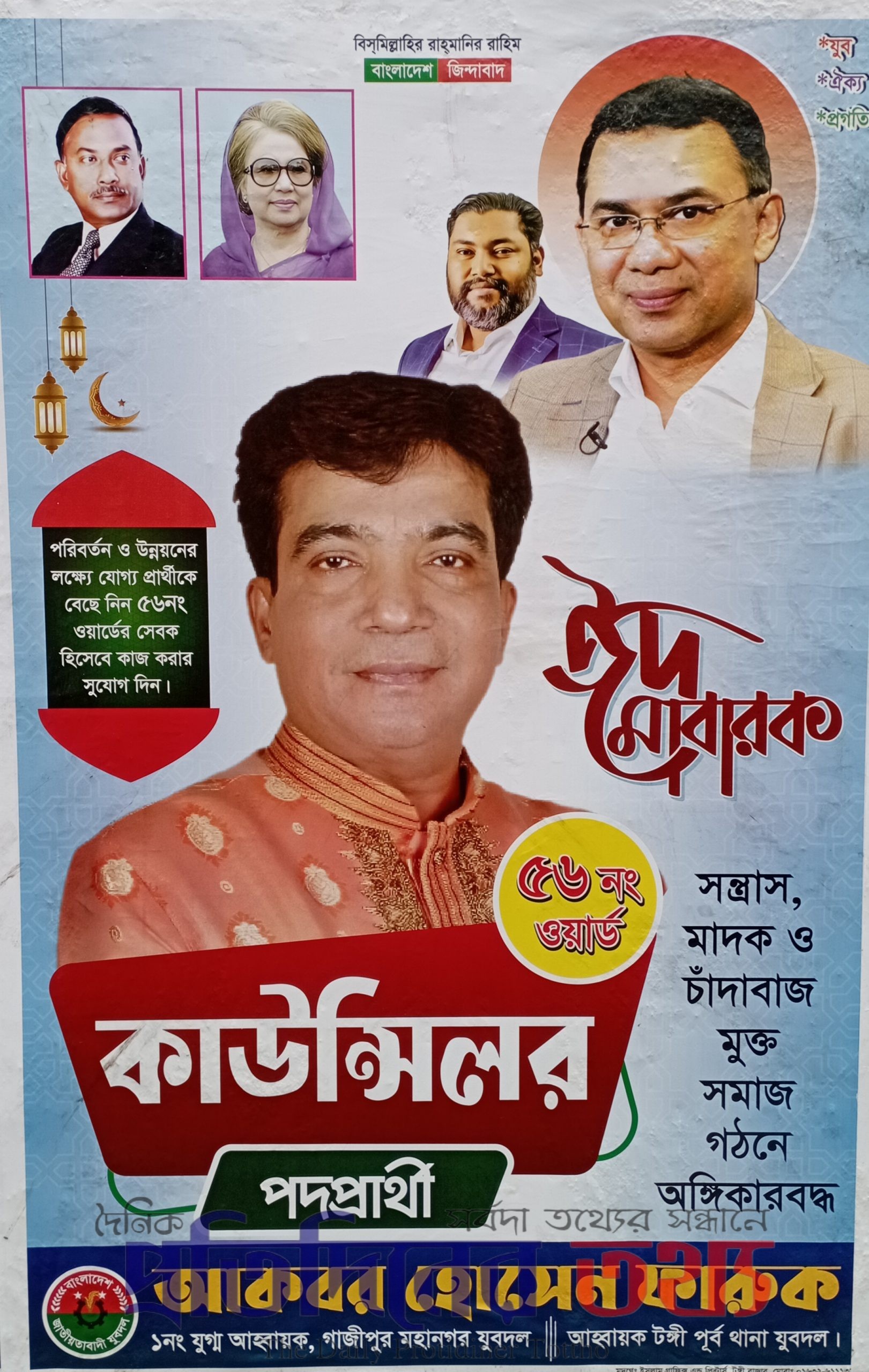 পবিত্র ঈদুল ফিতর উপলক্ষে গাজীপুর সিটি কর্পোরেশনের ৫৬ নং ওয়ার্ডবাসীকে আন্তরিক শুভেচ্ছা ও ঈদ মোবারক জানিয়েছেন কাউন্সিলর পদপ্রার্থী আকবর হোসেন ফারুক।