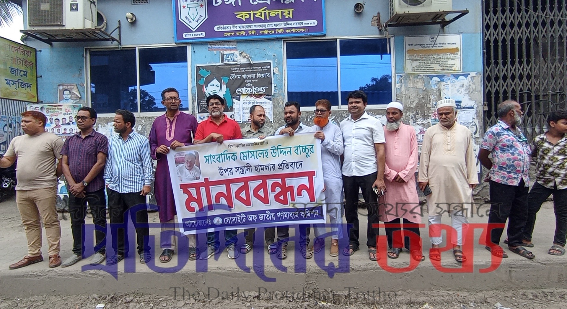 গাজীপুরে ঢাকা প্রেসক্লাবের সাধারণ সম্পাদক মোসলেহ উদ্দিন বাচ্চুর ওপর বর্বরোচিত সন্ত্রাসী হামলার প্রতিবাদে ফেটে পড়েছে স্থানীয় সাংবাদিক সমাজ। আজ রোববার (১৯ এপ্রিল) সকাল ১১টায় টঙ্গী প্রেসক্লাবের সামনে আয়োজিত এক বিশাল মানববন্ধনে গণমাধ্যমকর্মীরা প্রশাসনের প্রতি তীব্র ক্ষোভ প্রকাশ করেন এবং হামলাকারীদের আগামী ২৪ ঘণ্টার মধ্যে গ্রেপ্তারের আল্টিমেটাম দেন। অন্যথায় দেশজুড়ে কঠোর আন্দোলনের হুঁশিয়ারি দেওয়া হয়েছে।